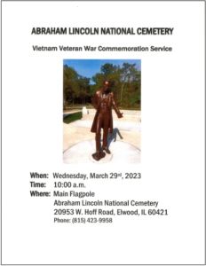 Vietnam Veteran War Commemoration Service at Abraham Lincoln National Cemetery by epapineau | Mar 29, 2023 | Veterans Event Date/Time Date(s) - 03/29/202310:00 am - 12:00 pm Location Abraham Lincoln National Cemetery Categories Veterans Event